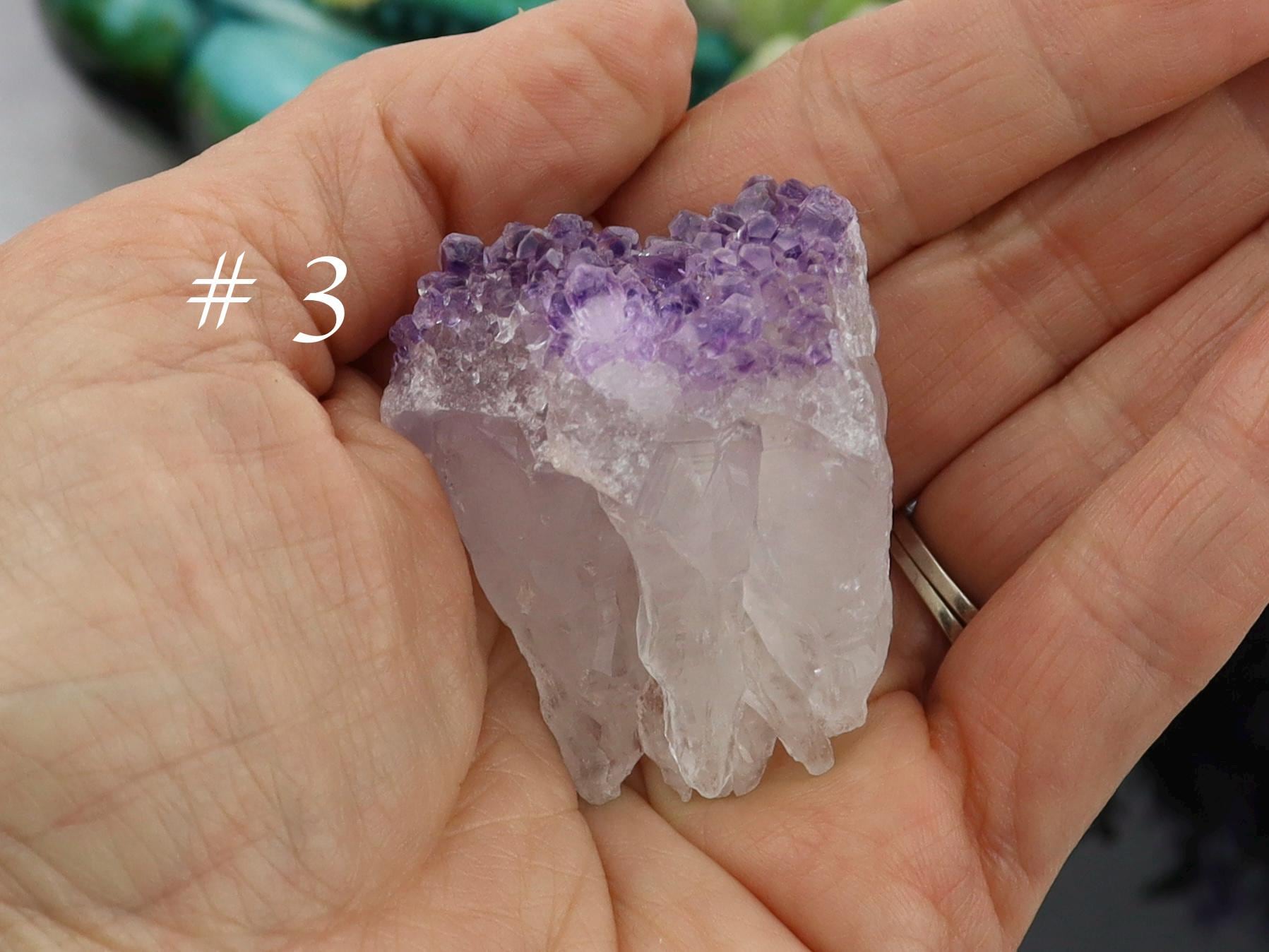 Origin: Brazil#1: Weight: 25 g/ 0.90 oz Measurements: 2.09” x 1.02”#2: Weight: 69 g/ 2.40 oz Measurements: 2.35" x 1.71"#3: Weight: 49.2 g/ 1.74 oz Measurements: 1.76" x 1.50"**Please read measurements photos are taken close up** — You will receive the exact item picturedRare high-grade sugar amethyst points from brazil have a magical sugar-like frosting of quartz on the tip. some points contain rainbows, phantoms, goethite and/or hollandite inclusions Due to the nature of this product some variations in appearance may occur due to lighting conditions during photography. With it being a product of the earth some naturally occurring imperfections such as cracks and blemishes may be present. I do my best to photograph these items so that you will see any of the above.