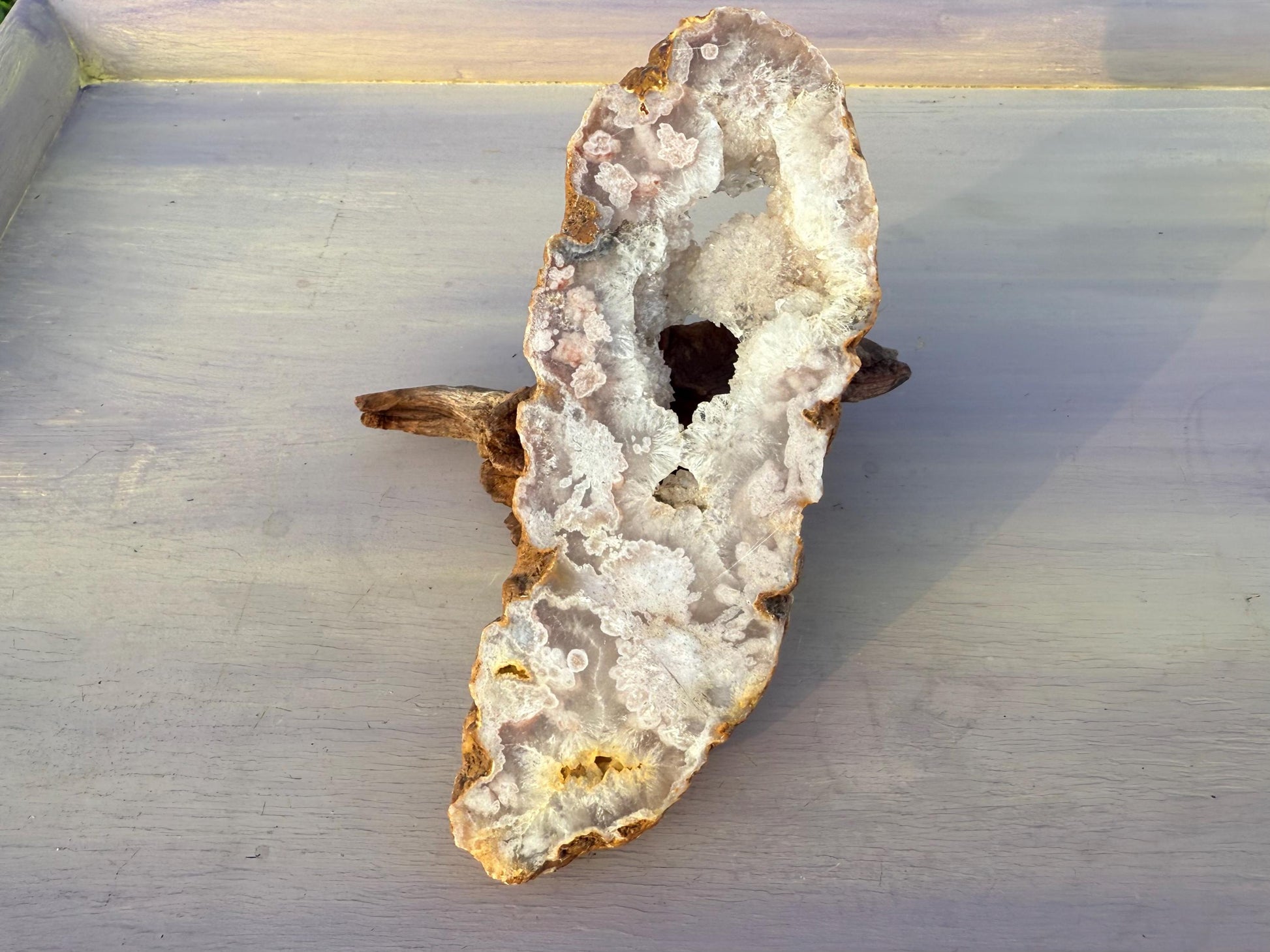 Druzy Pink Flower Agate Slice. This piece is one-of-a-kind, making it a thoughtful gift or a special treat for yourself. Elevate your space today with this exquisite crystal!Weight: 195.9 g/ 6.91 oz