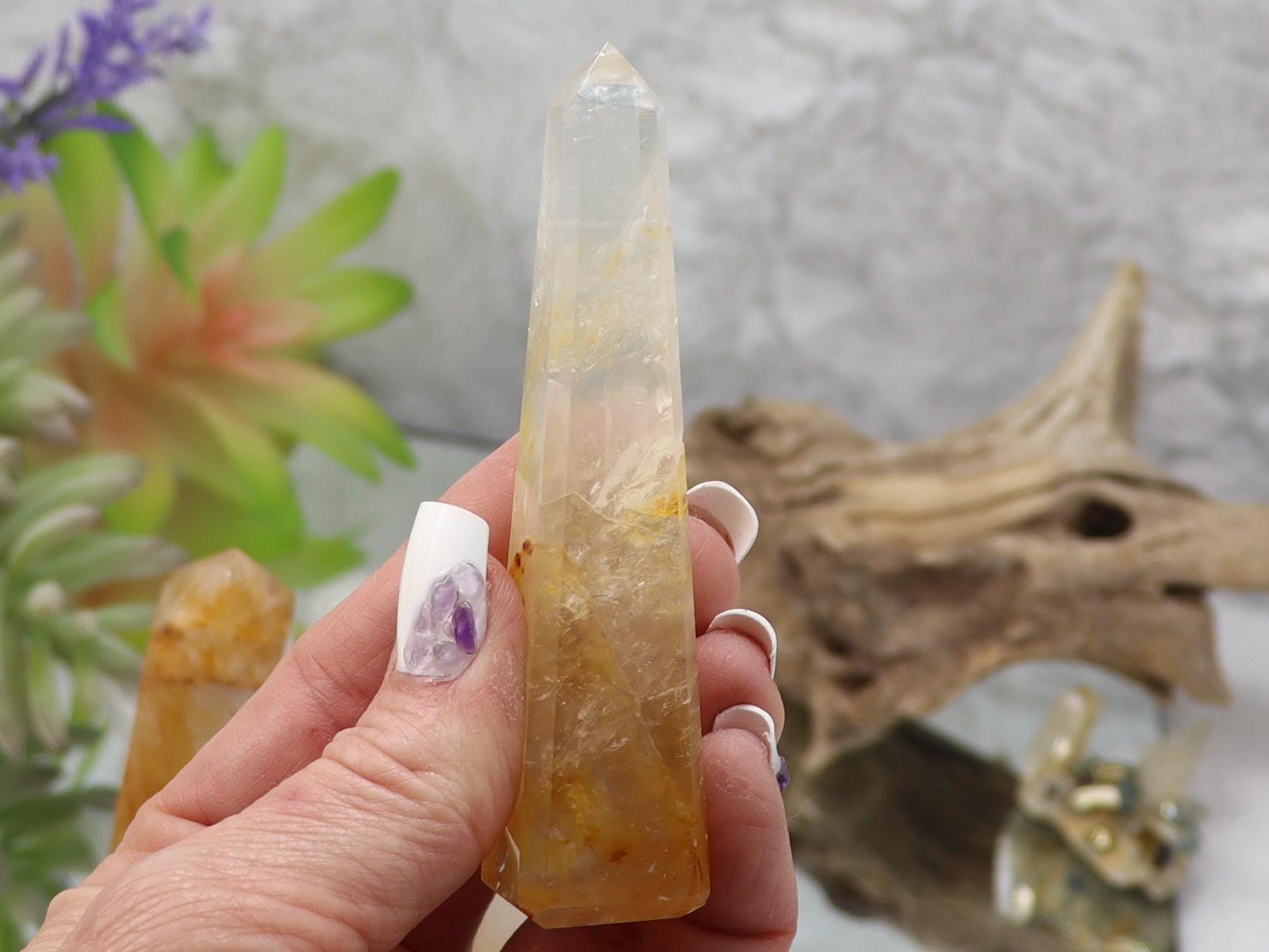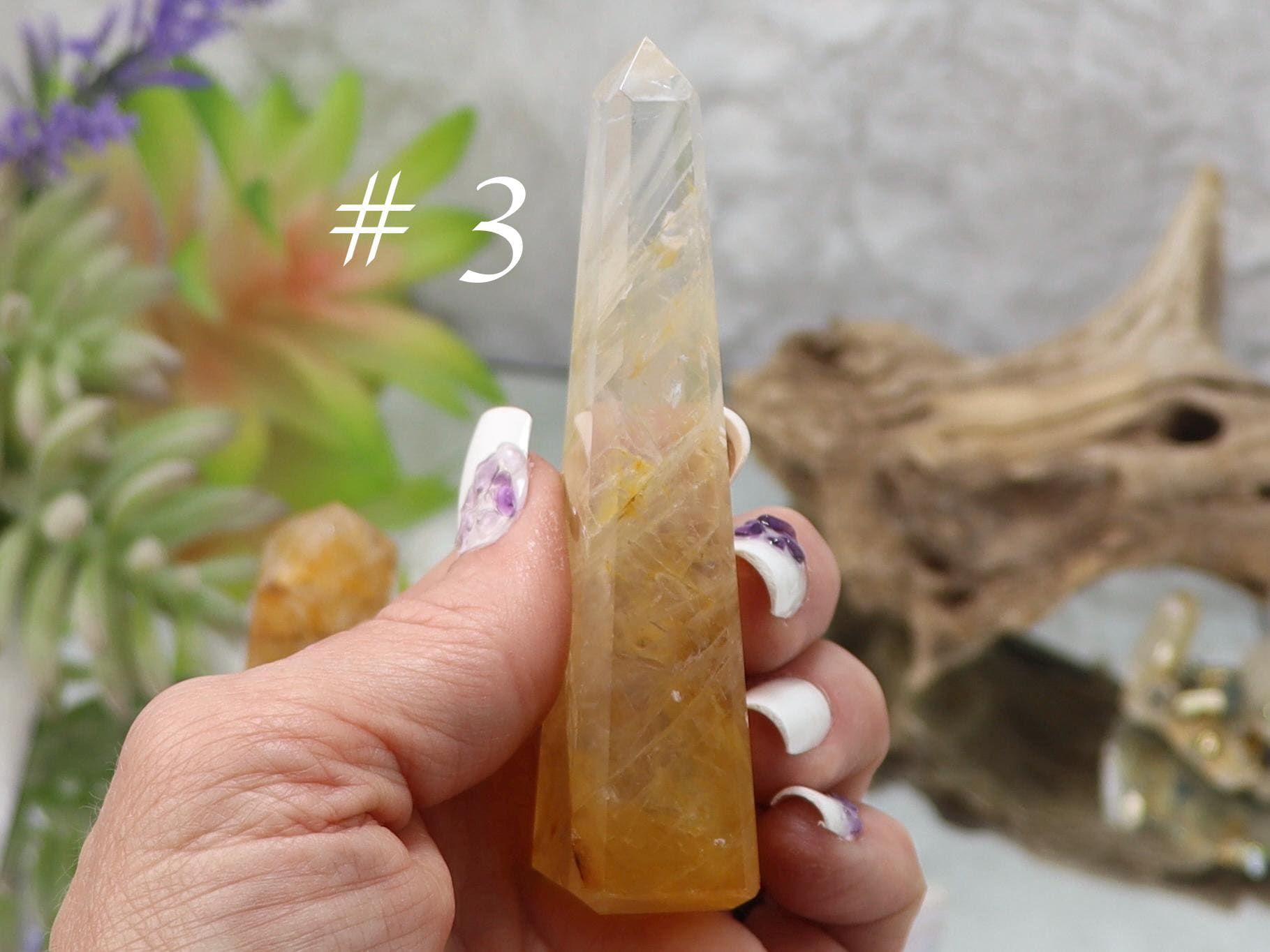Please choose the one you would like from the drop down menu# 1 - Weight: 118.2 g/ 4.17 oz. Size: 3.8" x 1.06" x 1.06"# 2 - Weight: 101.3 g/ 3.57 oz. Size: 4.08" x 1.03" x 1.00"#3 - Weight: 58.4 g / 2.06 oz Size: 3.63" x 0.81" x 0.80"- You will receive the exact item you choose - Please read measurementsGolden Healer Quartz is a golden variant of the combination of Hematite and Quartz.Disclaimer: Crystals are natural products the earth and are not always “perfect”. Some may have surface marks, inclusions, vugs (cavities) and/or natural chips. Also, many carvings are hand carved and may not be as pristine as a machine carved piece.We do our best to ensure our crystals are photographed to show all angles, but occasionally, smaller natural marks may not show up correctly or be photographed up close. Please feel free to reach out before purchasing if you want to see anything in more detail.We will always disclose damage that is not natural i.e. a broken crystal. If a crystal arrives broken, please reach out and we can help with initiating a claim, when applicable.