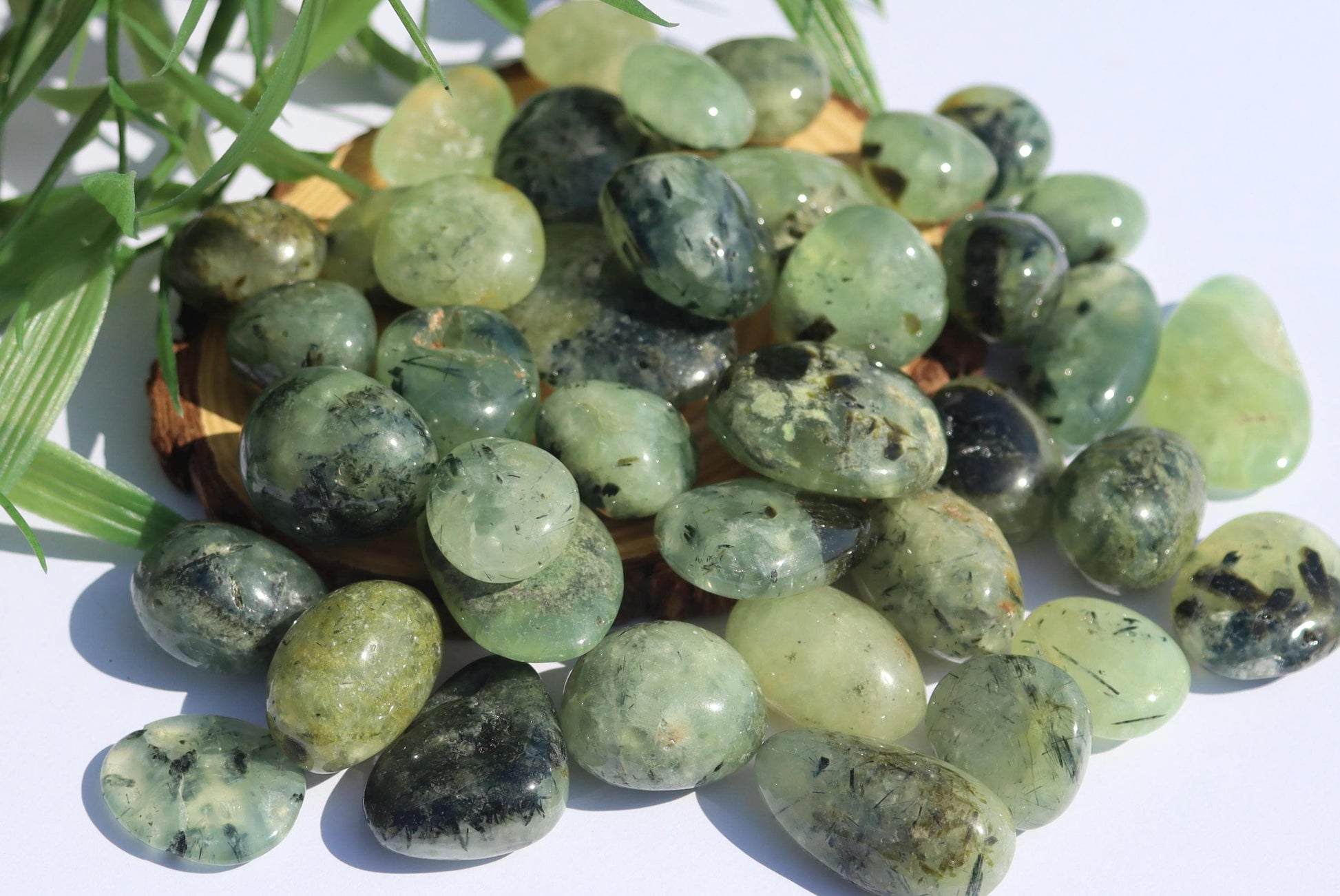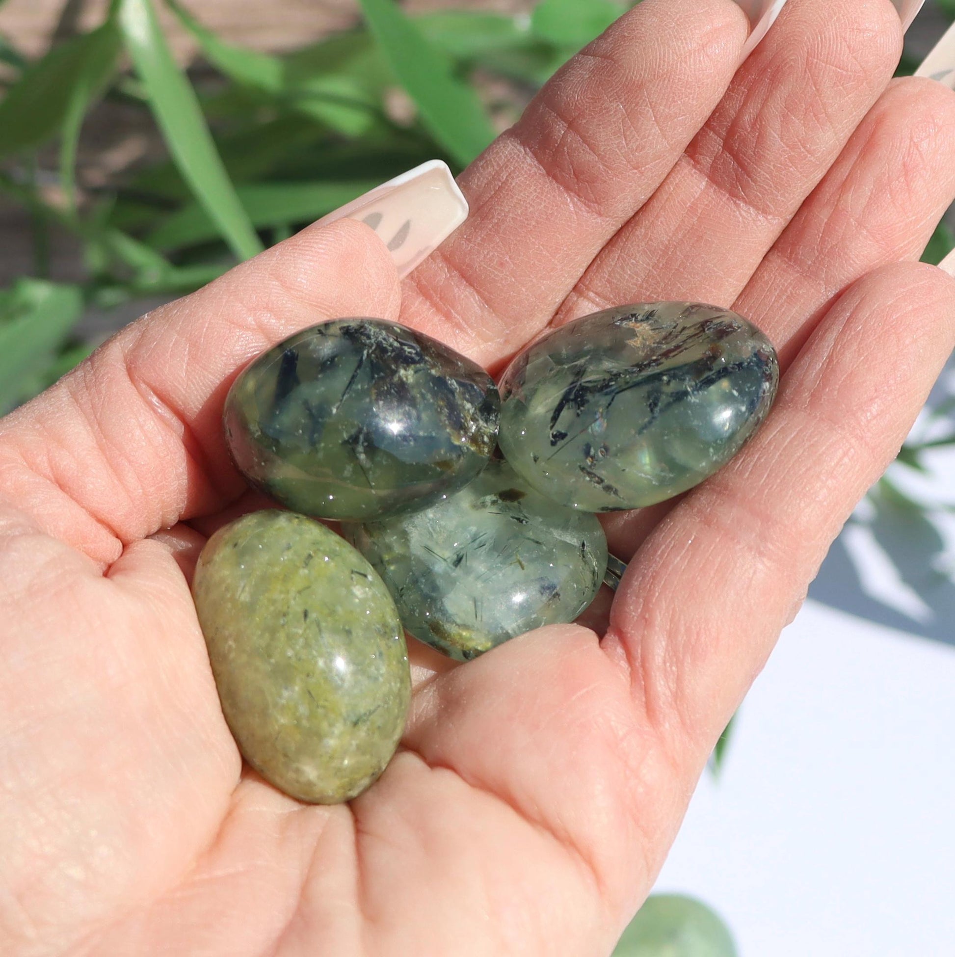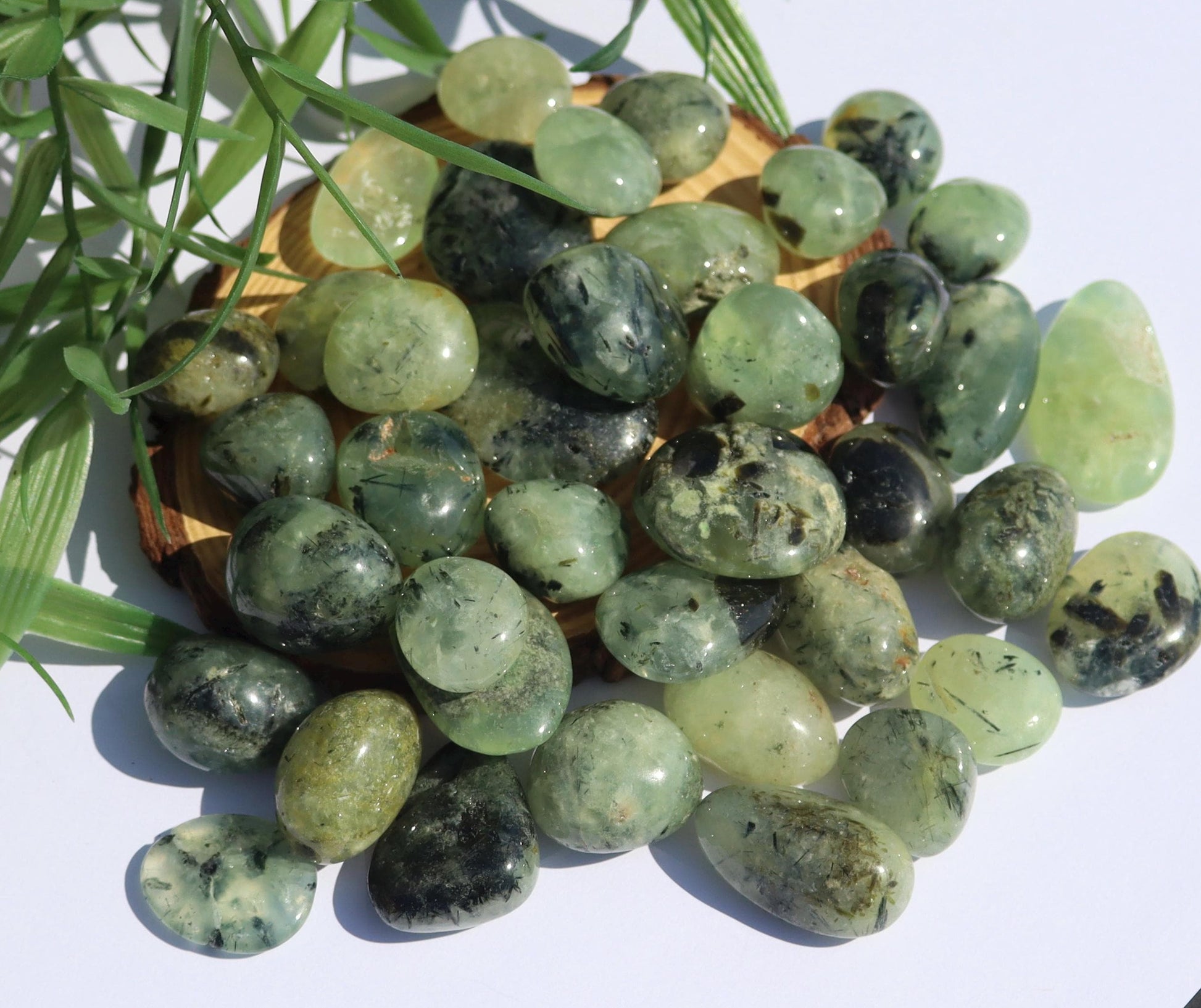 Please choose the weight range you would like your tumble to be chosen from from the drop down menu.- Shown in natural lighting - Photos are taken close up Prehnite, also known as "grape stone," is a naturally occurring silicate mineral with a unique and beautiful appearance. Named after its discoverer, Dutch Colonel Hendrik van Prehn, in the 18th century, Prehnite has been prized for its transparent to semi-transparent green coloration, resembling the freshly peeled skin of a grape.Due to the nature of this product some variations in appearance may occur due to lighting conditions during photography. With it being a product of the earth some naturally occurring imperfections such as cracks and blemishes may be present. I do my best to photograph these items so that you will see any of the above.⭐ Customer FeedbackYour feedback is deeply valued. Each review helps our small business grow and allows other customers to experience the beauty of our crystals with confidence. If you are delighted with your new piece, we would be honored if you shared your experience — customer photos are especially appreciated.If you encounter any concerns, please reach out directly so we may resolve them with care. Our goal is for every order to bring joy, healing, and beauty into your life.